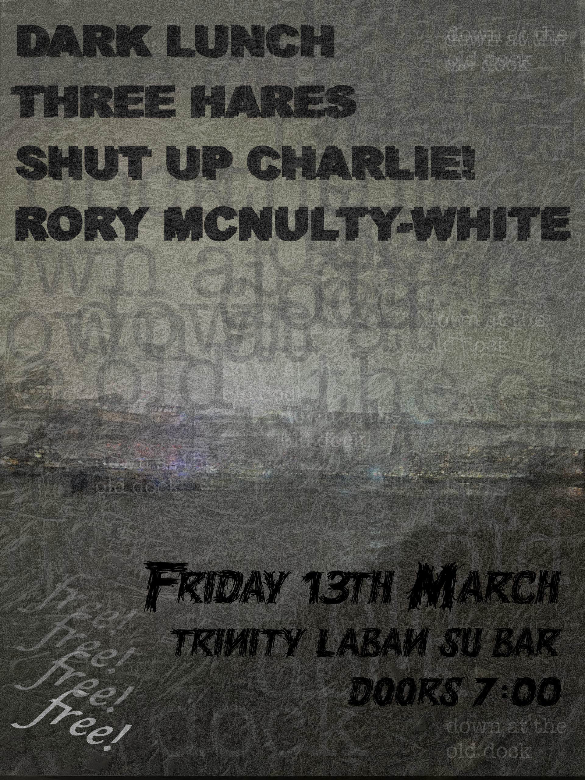 7:00 doors Bands include Rory White (and friends), Three Hares, Shut Up Charlie and Dark Lunch  10:30 end 11:00 closed!